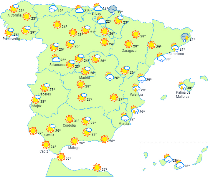 Varsler om kraftig nedbør og tordenvejr i Catalonien og på Balearerne. Der advares også om kraftig blæst på Galiciens nordvestkyst i slutningen af dagen.