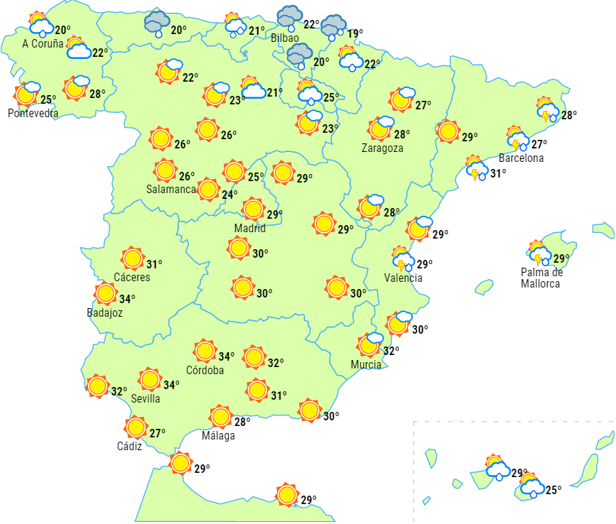Overvejende overskyet over den nordlige del af halvøen med nedbør, som lokalt kan være kraftig eller vedvarende ved nordvestkysten, og som i Catalonien vil være ledsaget af tordenvejr, der også kan være kraftigt og endda måske sende hagl ned over os.