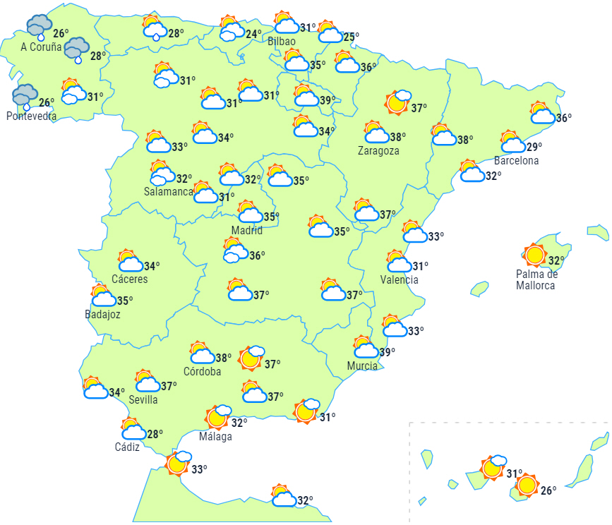 Varsler om meget høje temperaturer på Balearerne, i Andalusien og i det centrale og nordøstlige Spanien.