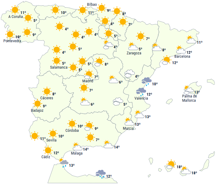 Således vil der være skyet eller overskyet himmel med nedbør ledsaget af tordenvejr på Balearerne, ved halvøens østkyst, i områderne ved Gibraltarstrædet og Melilla, men det kan også ende med at påvirke områder ved Alboran og de indre dele af den østlige tredjedel.