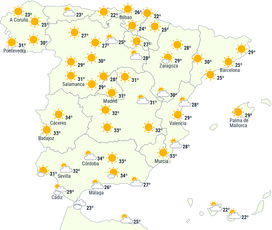Dagstemperaturerne vil generelt stige let til moderat. Der forventes at blive 34 til 36 grader på størstedelen af den sydlige halvdel af Den Iberiske Halvø, det nordlige højland, indlandsområderne i nordøst og endda i nogle områder af Galicien. Der ventes 38 til 40 grader på den sydvestlige del og i de nordøstlige dale.
