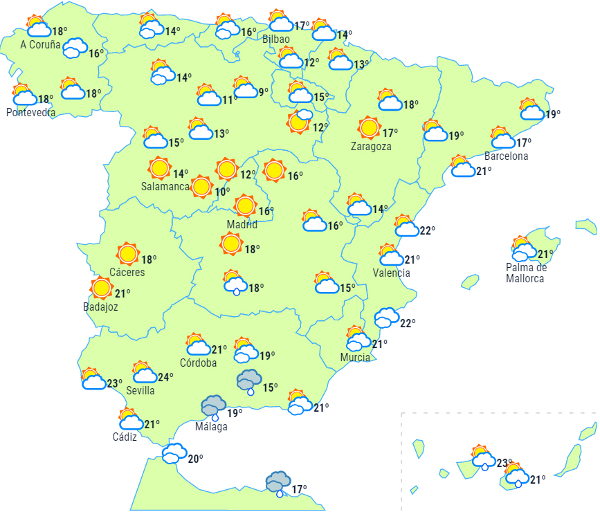 Dagstemperaturerne er svagt faldende på det meste af halvøen og Balearerne, og nattemperaturerne er faldende på den sydlige tredjedel af halvøen. Kun små ændringer i resten. Der vil forekomme svag frost i Pyrenæerne og - mere isoleret og mindre sandsynligt - i andre bjergkæder i det centrale og nordlige af fastlandet.