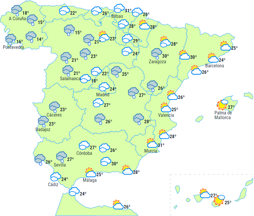 I det vestlige Galicien er der i perioder højtliggende skylag, der efterhånden tiltager til overskyet med nedbør, som lokalt kan være kraftig eller vedvarende. Den kan brede sig til resten af Galicien, men i en svagere og mere spredt form.