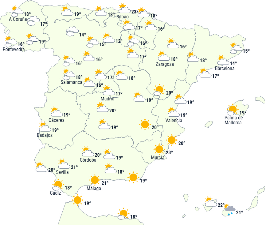 Dagstemperaturerne stiger på De Baleariske Øer samt på de østlige og vestlige tredjedele af Den Iberiske Halvø. Der vil være faldende temperaturer i det østlige højland, bjergene i Andalucía og Ampurdán. I resten af landet forventes ingen større ændringer.
