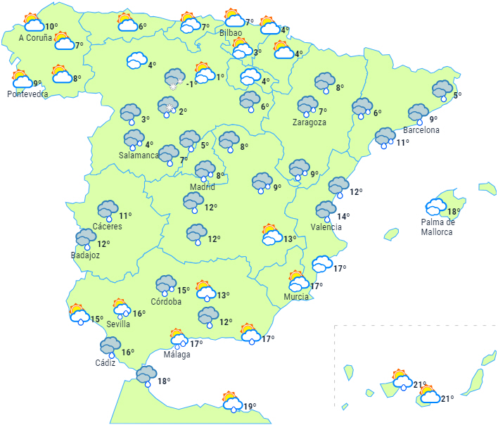 Temperaturerne vil falde kraftigt i hele landet, især på den nordlige halvdel af halvøen og De Baleariske Øer. Der er dog tendens til, at vejret bliver lidt mildere i løbet af dagen. Frost er begrænset til den nordlige halvdel af halvøen.