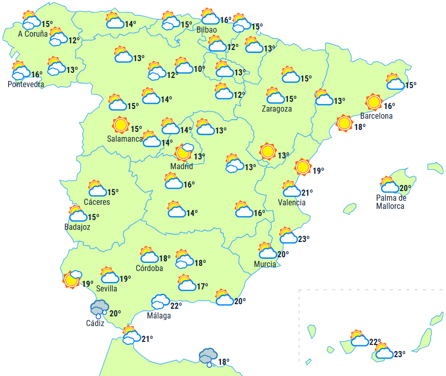 På halvøen og Balearerne ventes rigeligt med lavthængende skyer om morgenen, som generelt vil have tendens til at forsvinde og så blive mere letskyet.