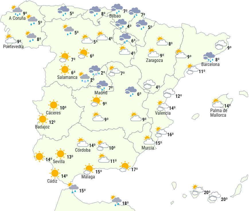 Svag frost i det nordlige indland, den nordøstlige del af det sydlige højland og bjergkæderne i sydøst, moderat frost i Pyrenæerne og De Iberiske Bjerge.