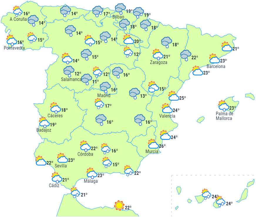 På halvøen forventes der en skyet eller overskyet himmel med en del nedbør næsten overalt, der lejlighedsvis bliver ledsaget af tordenvejr. Hele balladen bevæger sig fra vest mod øst. Nedbøren kan være lokalt kraftige og/eller vedvarende i store områder i den sydlige halvdel, nordvest og Pyrenæerne, men især det syd- og vestlige af Galicien, den vestlige del af de centrale bjerge og Pyrenæerne.