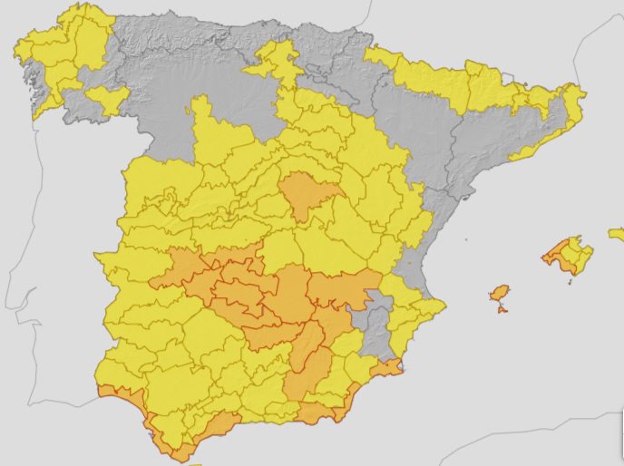 Varsler om lokalt kraftig og/eller vedvarende nedbør i store dele af den sydlige halvdel af halvøen, i nordvest og i Pyrenæerne. Dagens varselskort for regn alene ser sådan ud: