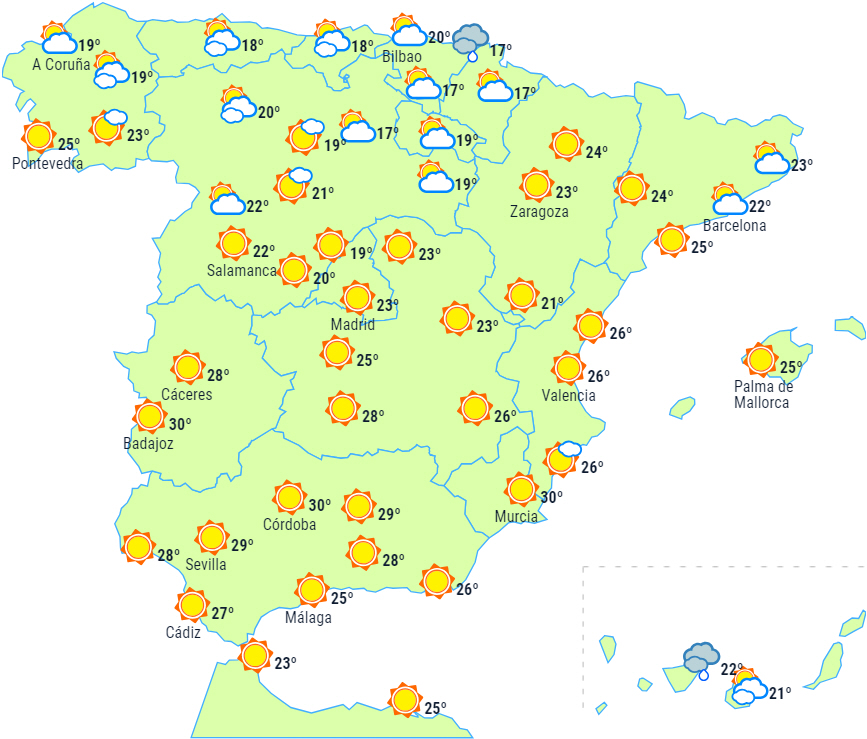 Stabilt vejr på halvøen og Balearerne med overvejende letskyet eller klar himmel. Kun i det nordlige Galicien, ved nordvestkysten, den øvre Ebro-dal og de vestlige Pyrenæer forventes overskyet himmel med svag og spredt nedbør, noget tungere i det østlige ende af nordvestkysten.