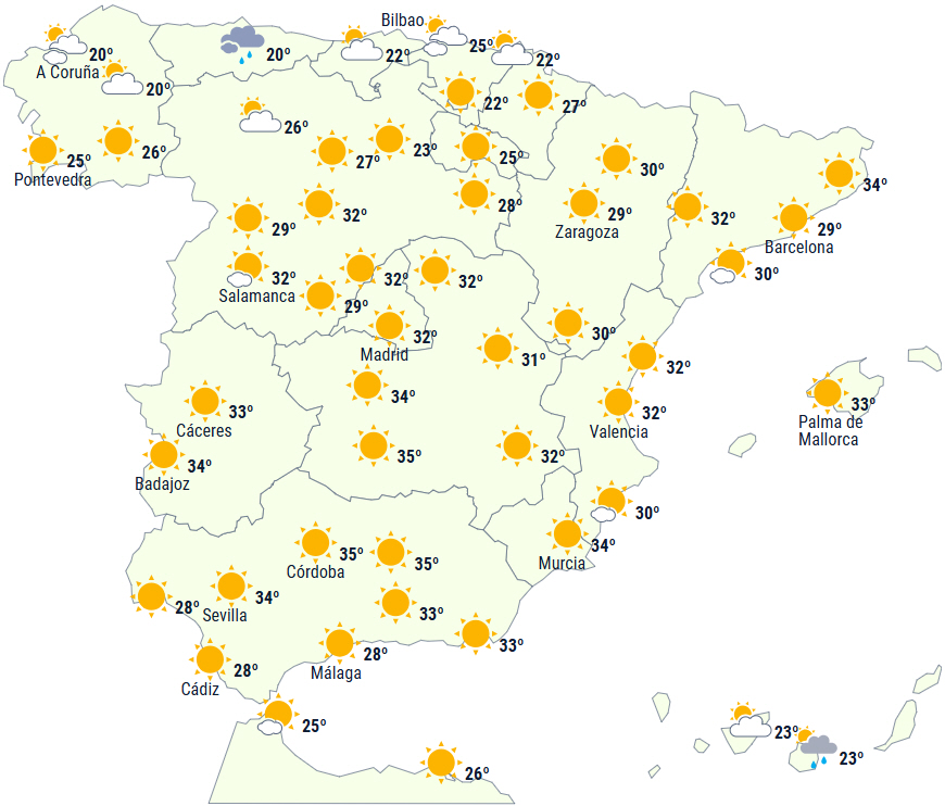 - Meget høje dagstemperaturer i den sydlige del af det nordlige højland, på den nordøstlige del af Den Iberiske Halvø og den sydlige halvdel af Den Iberiske Halvø, hvor der forventes 34 til 36 grader eller endnu højere. Temperaturen kan overstige 40 grader i Guadalquivir-dalen, Tajo-dalen og den ekstremaduriske Guadiana samt i de nordøstlige dale.