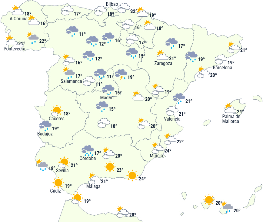 Der forventes kraftige byger med tordenvejr i det centrale og østlige område af halvøen samt det indre af Galicien og Extremadura. Disse byger kan lejlighedsvist være ledsaget af hagl. Syd for Sistema Central kan nedbøren lokalt være vedvarende.