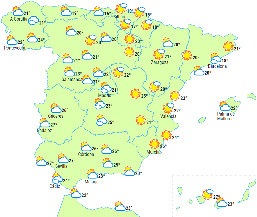 I begyndelsen af dagen er der overskyet på den nordlige del af halvøen, i Gibraltarstrædet, Melilla, ved Levantekysten, det østlige Catalonien og mulighed for enkelte lette byger på Balearerne. I løbet af dagen klarer det dog op i alle disse områder.