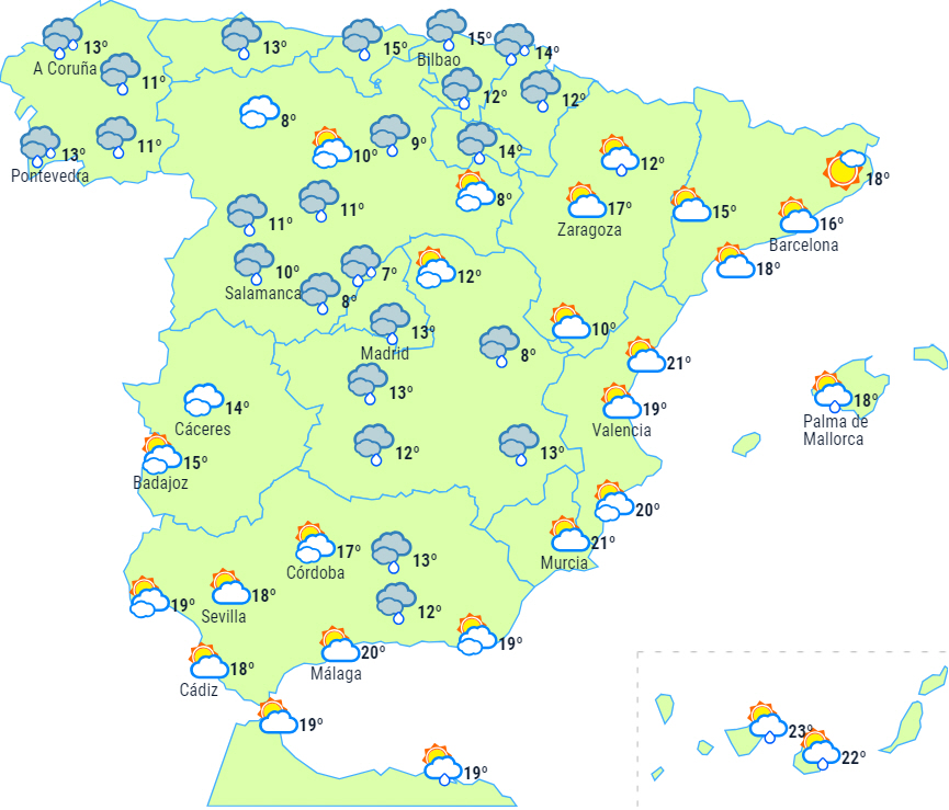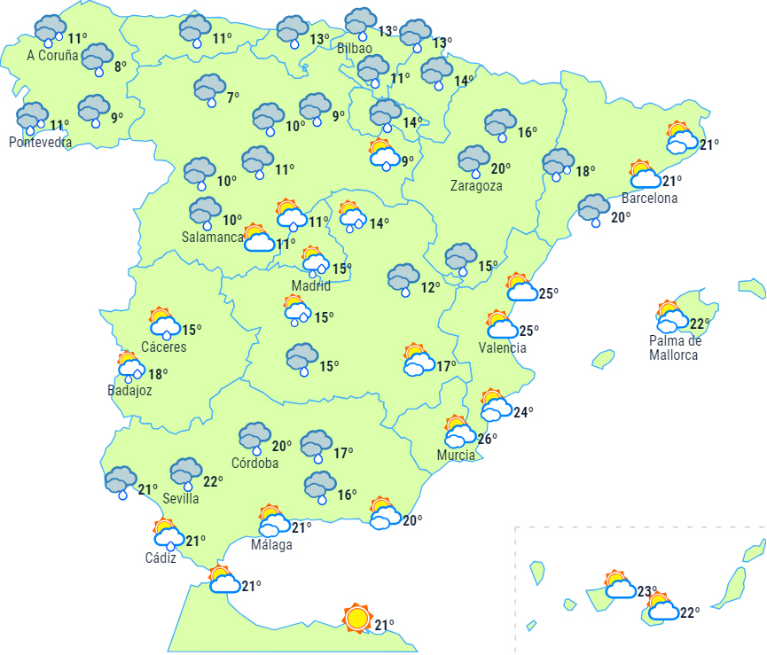 Overskyet himmel og næsten udbredt nedbør til halvøen. Kraftig nedbør til den nordvestlige del, den østlige del af nordvestkysten og Pyrenæerne, med lokalt kraftige eller vedvarende byger i Galicien og de omkringliggende områder, den østlige del af nordvestkysten og de vestlige Pyrenæer.