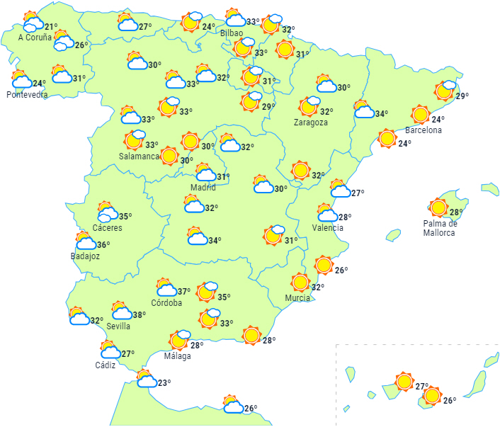 De usædvanligt høje niveauer for årstiden vil blive opretholdt i det meste af landet med temperaturer på 34 til 36 grader på det sydvestlige af halvøen, de østlige Kanariske Øer og den østlige ende af nordvestkysten inde i landet.