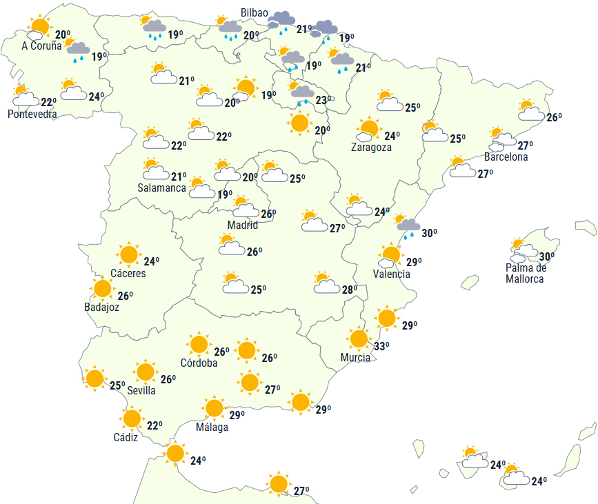 Helt i nord forventes letskyet himmel med regn og byger, der er mere hyppige, vedvarende og med torden i det østlige Cantabrien, samt morgen- og aften-tåge.