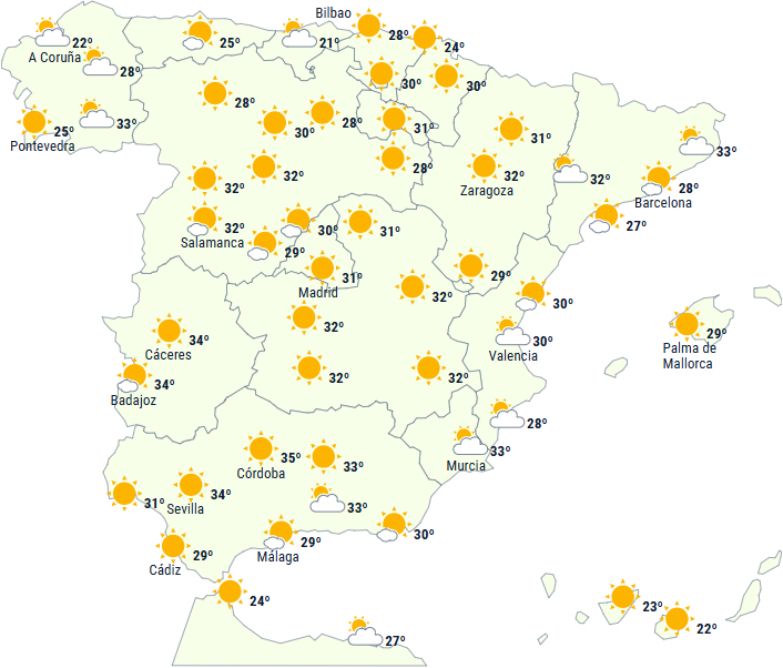 Dagstemperaturerne vil stige ved kysterne i Cantabrien, Cádiz-bugten samt på de østlige og nordøstlige egne af halvøen, mens de vil falde på den nordlige del af atlanterhavssiden, Gibraltarstrædet og det vestlige Alborán. Få ændringer i resten af landet. Det forventes at komme op på 34 til 36 grader på størstedelen af den sydlige halvdel og den nordøstlige del af Den Iberiske Halvø, samt i dele af det nordlige højland, dalene i nordvest og visse indlandsområder i Cantabrien. Det er sandsynligt, at temperaturen når helt op på 40 grader i de nordøstlige dale og store dele af den sydlige atlanterhavsside.