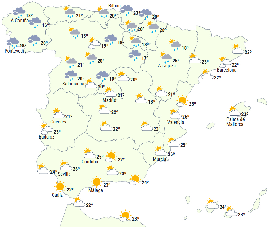 Det forventes, at Den Iberiske Halvø og De Baleariske Øer kommer under indflydelse af et atlantisk vejrsysten med passage af flere fronter, der giver letskyet til overskyet himmel, dog dominerer højtliggende skyer over den sydlige halvdel af halvøen og på De Baleariske Øer ved dagens afslutning.