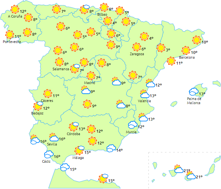 Der forventes overskyet vejr ved nordvestkysten, den øvre Ebro-dal og i Pyrenæerne med sandsynlighed for spredt, let regn i begyndelsen af dagen. Det kan falde som sne ned i meget lave højder, men der er dog ikketale om betydelige mængder.