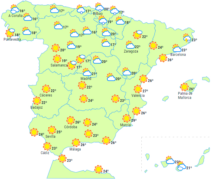 Det meste af landet får letskyet eller klart vejr, og kun i det fjerne nord forventes overskyet himmel eller perioder med det og mulighed for noget svag og spredt nedbør - mere sandsynligt og noget mere intens i det østlige Cantabrien og Pyrenæerne.