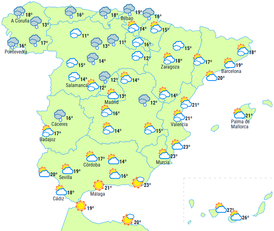 Der vil være nedbør i Galicien og Pyrenæerne, som vil have tendens til at intensivere og blive mere udbredt på den nordlige del af halvøen i løbet af dagens anden halvdel med ankomsten af en front.