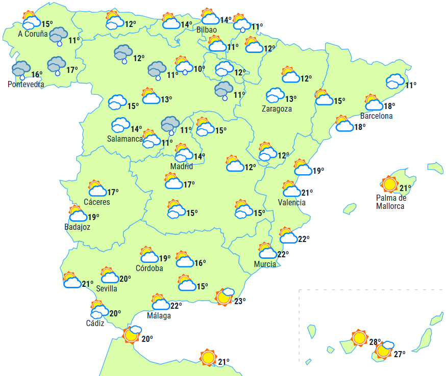 På De Kanariske Øer vil resterne af en DANA stadig give ustabilt vejr med overskyet himmel i perioder og sandsynlighed for byger og torden i de bjergrige egne, men det kan heller ikke udelukkes på resten af øerne.