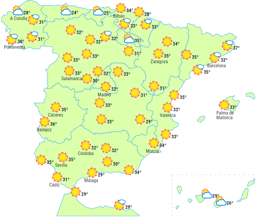 Advarsler om meget høje temperaturer i det meste af landet undtagen det cantabriske område og den sydlige halvdel af Middelhavsområdet.