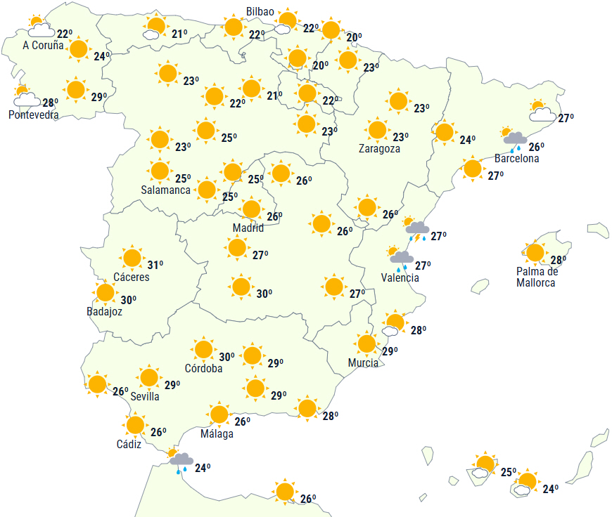 Dagstemperaturerne i let fald på middelhavssiden og på De Baleariske Øer og ellers generelt stigende. Der vil blive overskredet 35 grader i sydvestlige dale.