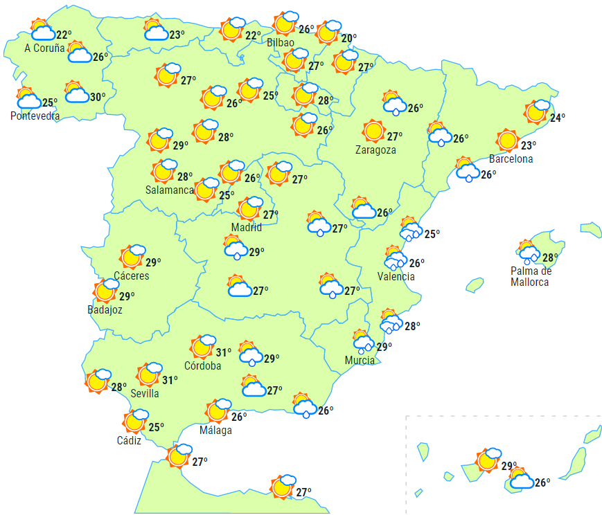I løbet af eftermiddagen kommer der flere skyer over den østlige, sydlige og centrale del af halvøen samt på resten af Balearerne, og det giver regn- og tordenbyger til den sydøstlige del af halvøen - muligvis lokalt kraftige byger i Murcia og det østlige Andalusien.