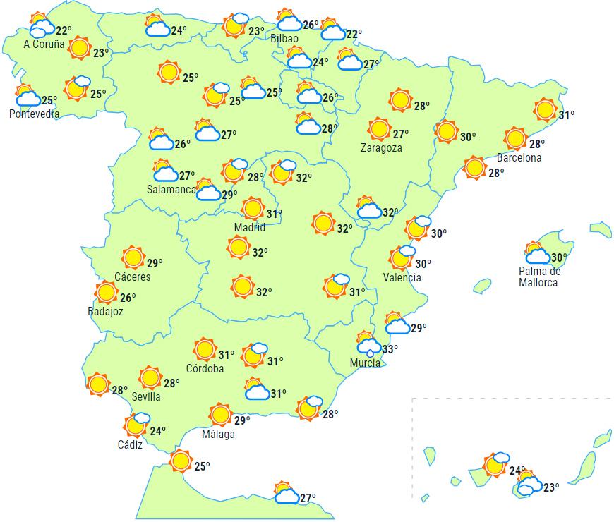 I løbet af dagen forventes der flere skyer i det centrale og sydøstlige af halvøen med mulighed for spredte byger og tordenvejr til den østlige tredjedel, dog mere sandsynligt i bjergene og og lokalt tung nedbør i Pyrenæerne, det østlige af De Iberiske Bjerge og det østlige La Mancha, men vi kan som nævnt heller ikke udelukke de sydøstlige bjerge.
