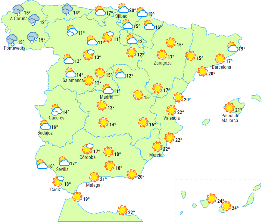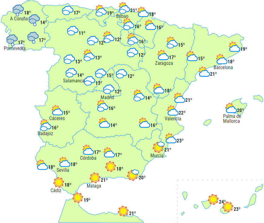 Skyet eller overskyet vejr i Galicien, det nordvestlige Castilla y León og vestlige Asturien med kraftig nedbør i Galicien, som vil være vedvarende og lokalt kraftig i den vestlige halvdel, og som vil brede sig til resten af området i løbet af dagen, om end med mindre intensitet.