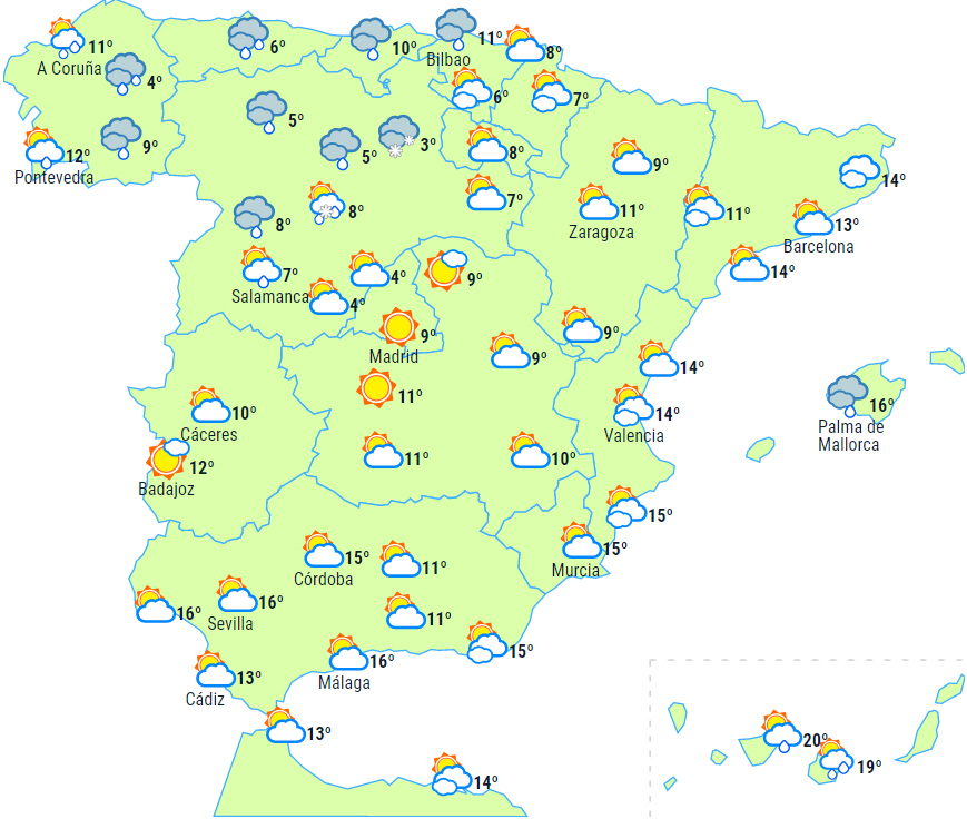 Varsler om nedbør i det cantabriske område og snefald i bjergområderne på den nordlige halvdel af halvøen.