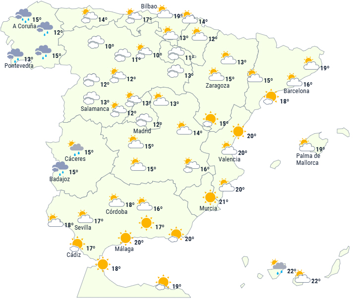 På De Kanariske Øer forventes en situation med post-frontal ustabilitet at fortsætte med overskyet himmel og byger ledsaget af tordenvejr, der sandsynligvis vil være stærke og give en ordentlig sjat til de nordlige dele af de vestlige øer. Der er også risiko for sne på bjergtoppe over 2.000/2.200 meter.