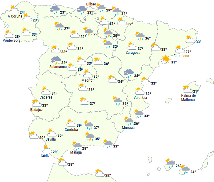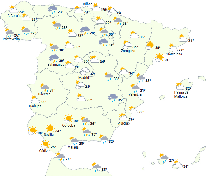 Dagstemperaturerne forventes at falde i sydvest, stige på den helt nordøstlige del af fastlandet og i Galicien, mens der ikke forventes ændringer i sydøst, på De Baleariske Øer eller på De Kanariske Øer. Der forventes 34 til 36 grader i Extremadura, på De Baleariske Øer samt på den sydøstlige og nordøstlige del af Den Iberiske Halvø. Vi kan endda nå 38 til 40 grader i dalene på den nordøstlige del og i det østlige af Andalusien.