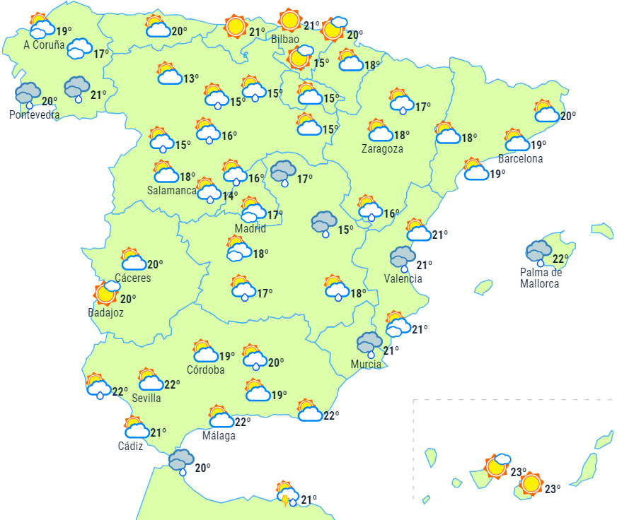 På resten af halvøen forventes lavthængende skyer om morgenen over den nordvestlige og cantabriske del, men det har tendens til at klare nogenlunde op og senere blive erstattet af mellem- og højtliggende skyer, der kommer ind fra sydvest, og det kan kaste noget svag og spredt regn af sig i det vestlige Andalusien og Extremadura.