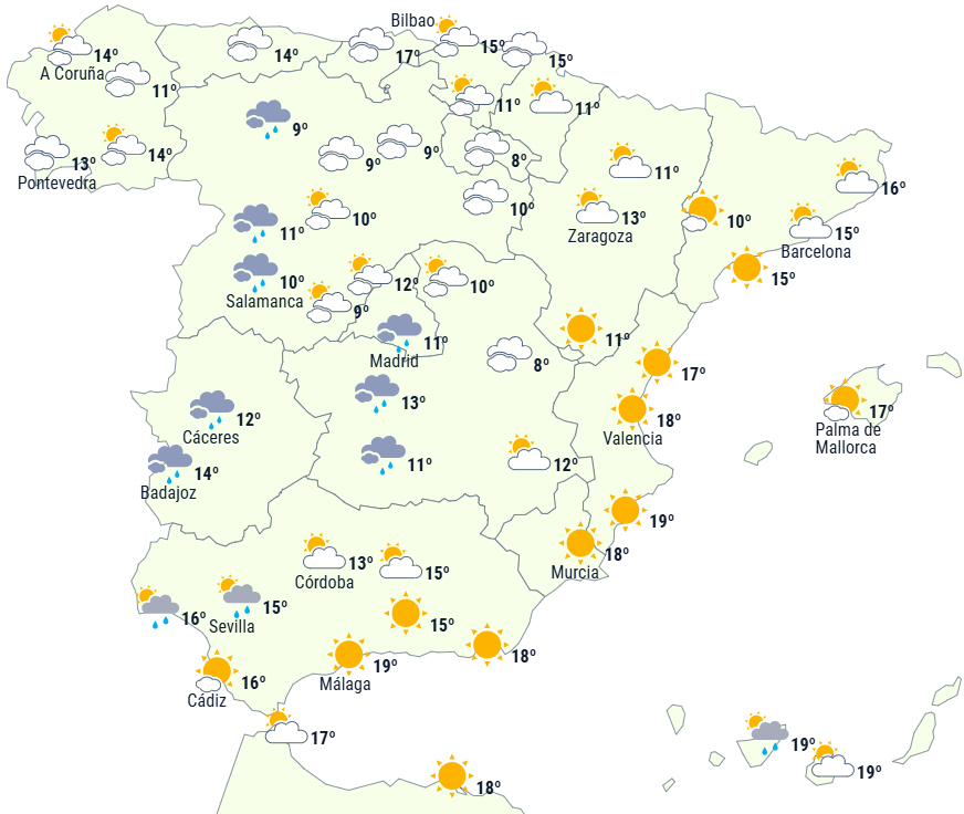 Der forventes en form for overgangsdag mellem passagen af fronter forbundet med Garoé-stormen og ankomsten af en ny front forbundet med Éowyn-stormen. Således forventes klar himmel langs Middelhavskysten og på Balearerne og overskyet himmel i resten af landet. I den vestlige del af Galicien vil tilnærmelsen til en front give nedbør, der har tendens til at tage til i løbet af dagen, så den kan være kraftig og/eller vedvarende i den vestlige halvdel og kan brede sig til andre områder i nordvest.