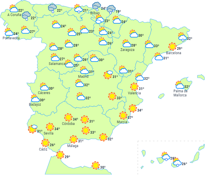 Dagstemperaturerne vil stige i Middelhavsområdet og falde i resten af landet, især i den øvre del af Ebro-dalen og de omkringliggende områder. Dagstemperaturerne vil sandsynligvis nå op på 40 til 42 grader i indlandet i den sydøstlige del af landet og på Valencias kyst, mens nattemperaturerne ikke kommer under 24 til 26 grader i Middelhavsområdet.