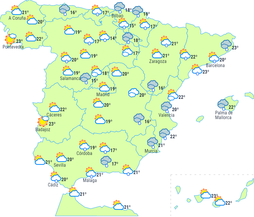 Det ustabile vejr forventes at fortsætte på halvøen og Balearerne med overskyet himmel med byger og tordenvejr. I dagens første halvdel kan nedbøren stadig være kraftig eller vedvarende i de førnævnte områder.