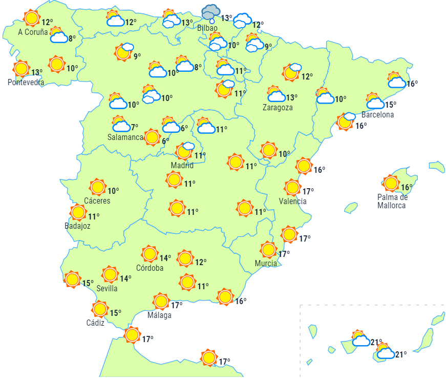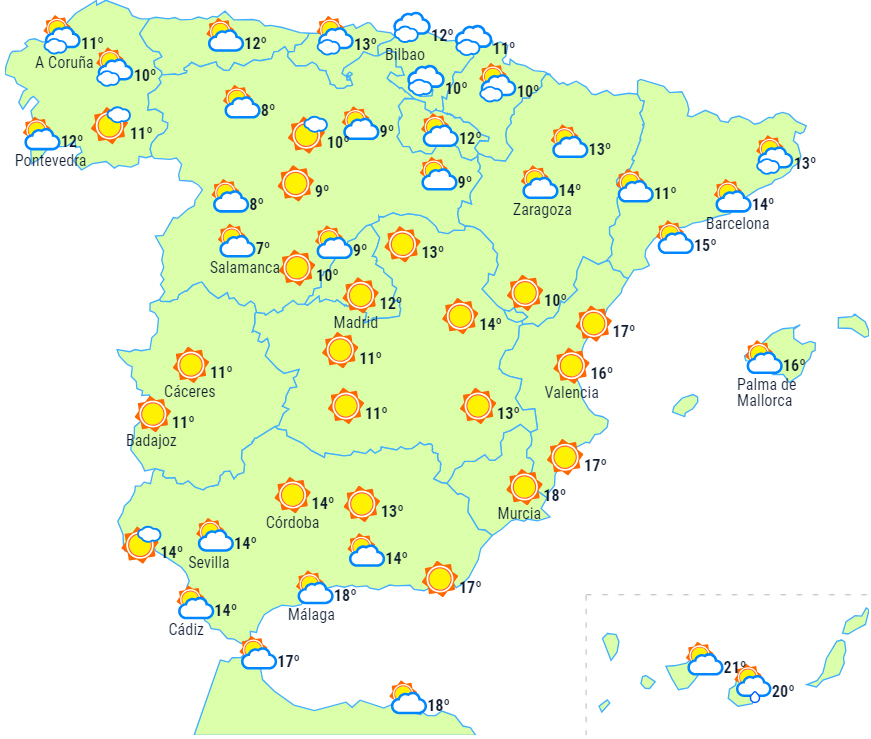 Dagstemperaturerne vil stige på den østlige halvdel af halvøen og falde på De Kanariske Øer, hvor de dermed rammer normalen for årstiden. Nattemperaturerne vil falde på den helt nordvestlige del og i dalene på den atlantiske side, mens de vil stige på den nordøstlige tredjedel med frost i bjergene og i højlandet, mens mere intens frost i Pyrenæerne. Temperaturerne vil generelt falde på De Kanariske Øer.