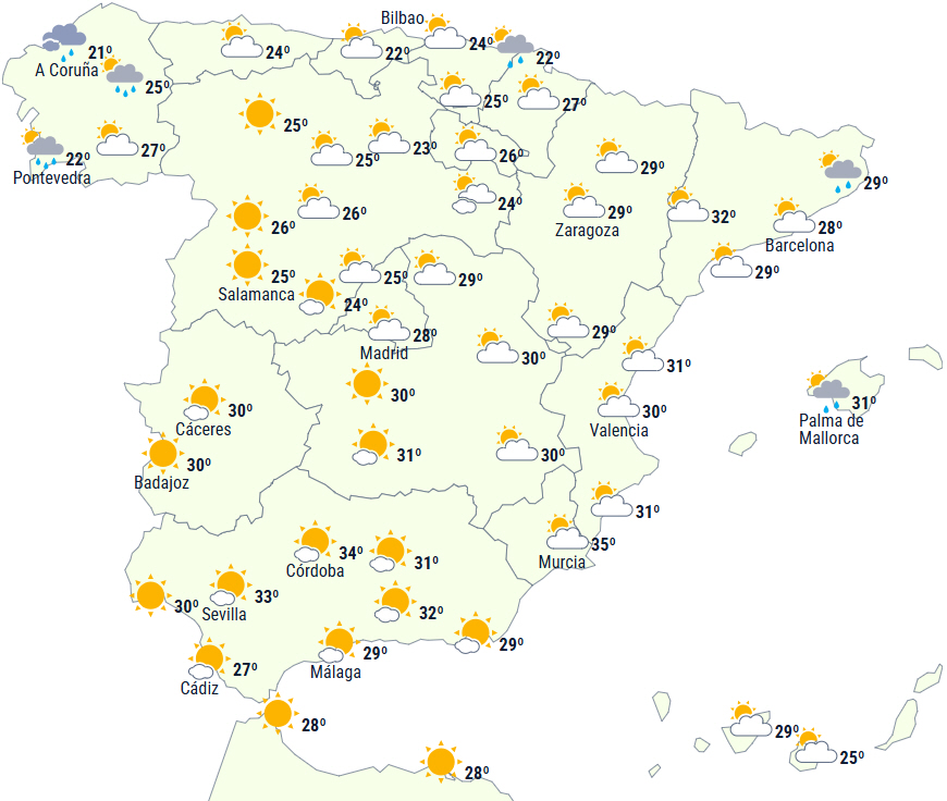 Dagstemperaturerne vil falde på De Kanariske Øer og i indlandsområderne af den østlige tredjedel af fastlandet, mens de stiger i de sydvestlige dele, det øvre af Ebro-dalen og Ampurdán. Ingen signifikante ændringer i resten. Vi kan komme over 25 grader i Guadalquivir samt lokalt i Guadiana, Tajo og Ebro.