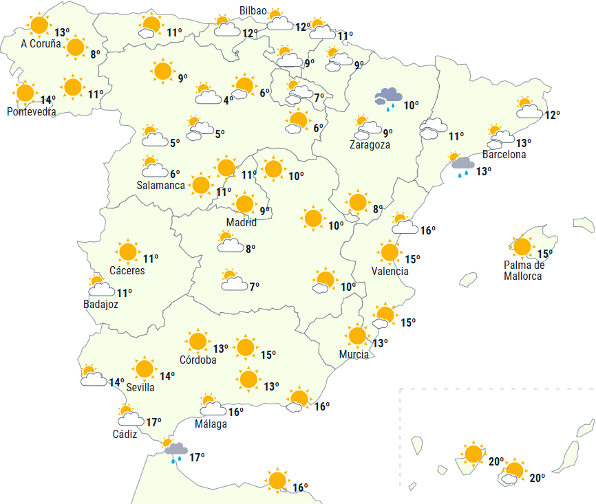 Der vil således være letskyet eller klar himmel, dog med en del lavthængende skyer om morgenen på den nordlige halvdel og den østlige tredjedel af halvøen samt ved Gibraltarstrædet, Alboran og dele af den sydlige højslette. Tåge og dis forventes i store områder, og de kan være tættere og mere vedholdende i Ebro-dalen, nordøstlige dale, Lugo, La Mancha, Guadiana-dalen og især på den nordlige højslette.