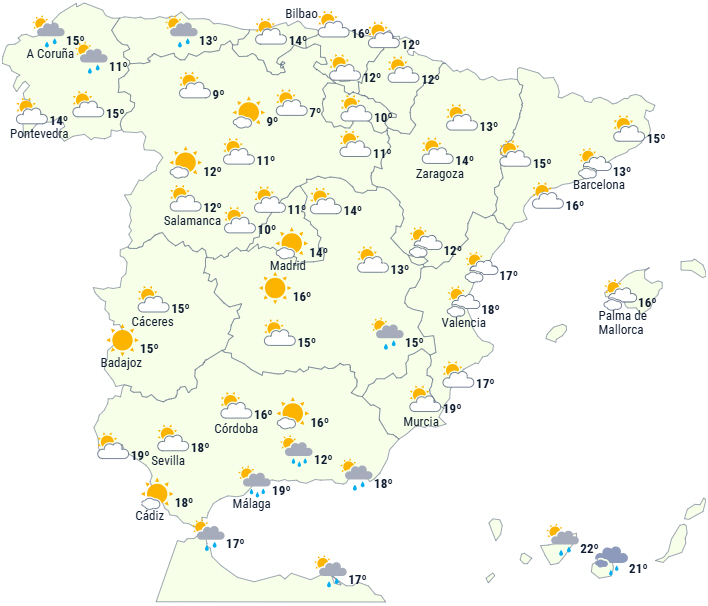 I dag forventes mere stabilt vejr efter passagen af en Atlanterhavsfront den foregående dag. Således vil resterne af fronten stadig give svag nedbør ned over De Baleariske Øer, det østlige af områderne langs Det Cantabriske Hav, Pyrenæerne og måske også i det indre og helt sydvestlige af halvøen.