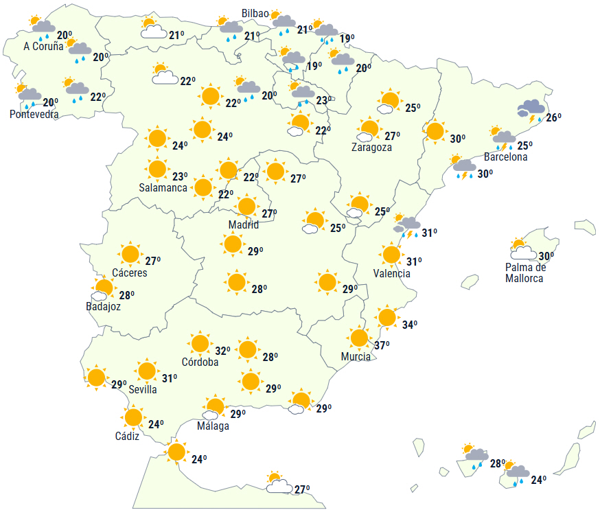 Bortset fra stigninger på De Baleariske Øer og lokalt ved Middelhavskysten vil dagstemperaturerne generelt falde - endda bemærkelsesværdige fald på den vestlige del af halvøen. Vi overstiger 36 grader på Mallorca og Menorca, og det kan heller ikke udelukkes i det mediterrane område.