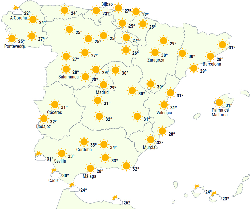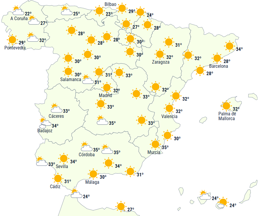 Der forventes en generel stigning i dagstemperaturerne, bortset fra ved Alborán, hvor de kan falde let. Det forventes at vi kommer op på 34 til 36 grader i den sydlige halvdel af den atlantiske side og i den nordøstlige del af fastlandet - endda 40 grader i Guadalquivir-dalen og lokalt i Bajo Guadiana og den nedre Ebro-dal.