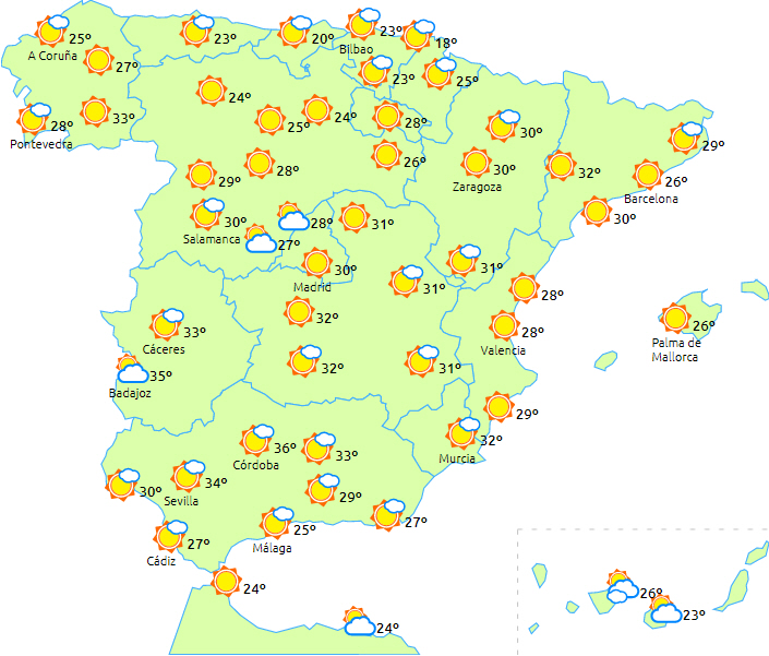 Dagstemperaturerne stiger over hele linjen, men varmest med over 30 grader i det indre af den sydvestlige del af halvøen og måske også i dalene i det sydlige Galicien samt i Huesca og Lleida. Minimumstemperaturerne vil stige i halvøens indre egne. Kun få ændringer i resten af landet.