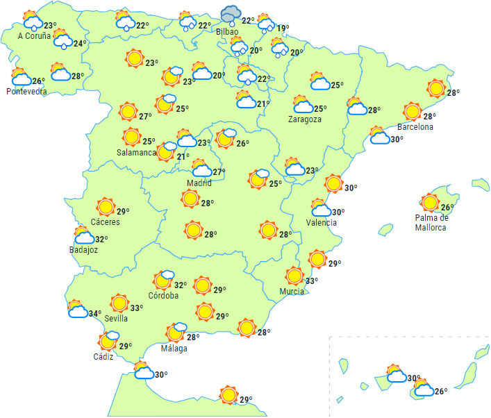 Dagstemperaturerne falder på de sydøstlige kyster, ved Alboran og på De Kanariske Øer, små ændringer på De Baleariske Øer og helt i nord, mens de er stigende i resten af landet. Varmest i Guadalquivir med 32 til 34 grader, og nætterne er fortsat godt lune i kystområderne i sydøst og på Balearerne, hvor den ligger på 24 til 26 grader.