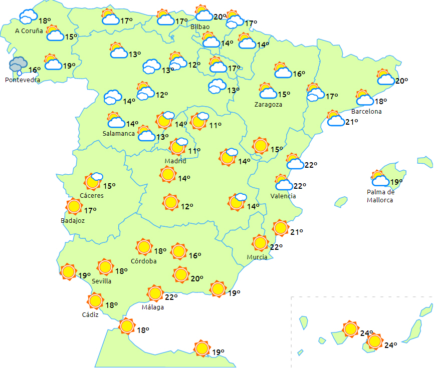Skyet eller overskyet med nedbør i Galicien og Pyrenæerne. I begyndelsen er det også overskyet i resten af Atlanterhavsregionen og i områderne langs nordvestkysten med mulighed for svag og stedvis nedbør, men med tendens til at opklaring i løbet af dagen.