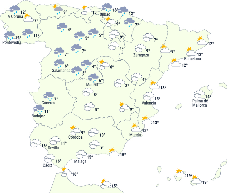 I løbet af dagen forventes skyerne generelt at aftage, og der vil komme opklaring og mindre nedbør, selv om det forventes at fortsætte i Galicien, Det Cantabriske Hav og Pyrenæerne og på De Baleariske Øer i løbet af dagens anden halvdel.