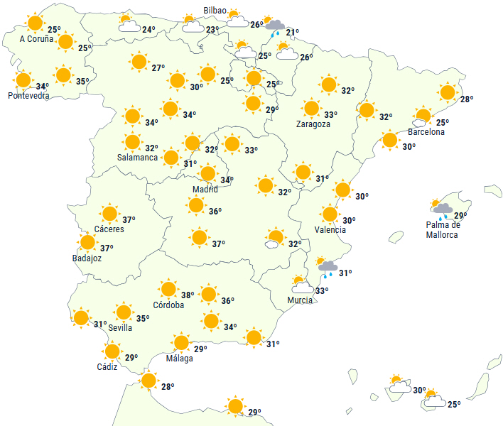 - Høje dagstemperaturer på 34 til 36 grader i det indre sydvestlige hjørne af fastlandet og på dele af De Kanariske Øer.