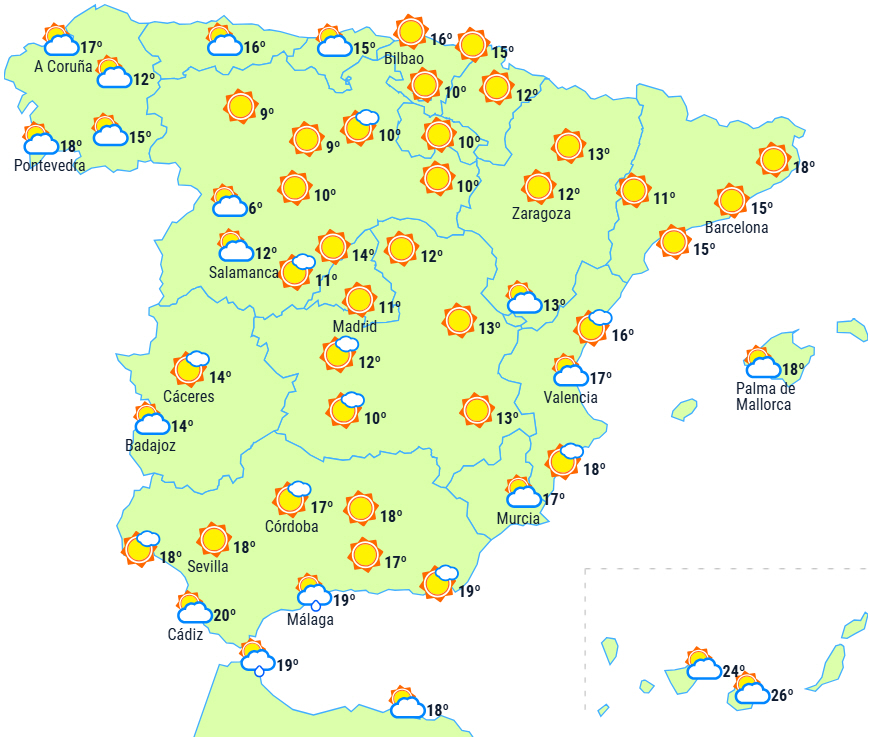 Et højtryk forventes at herske over halvøen og Balearerne i dag med overvejende letskyet eller klar himmel. Kun i den helt vestlige del af halvøen vil en front forårsage tiltagende skydække sidst på dagen. Der vil også være lavthængende skyer med morgendis og tåge i højlandet, Ebro-dalen, de nordøstlige dale, på Balearerne og den sydøstlige del af halvøen.
